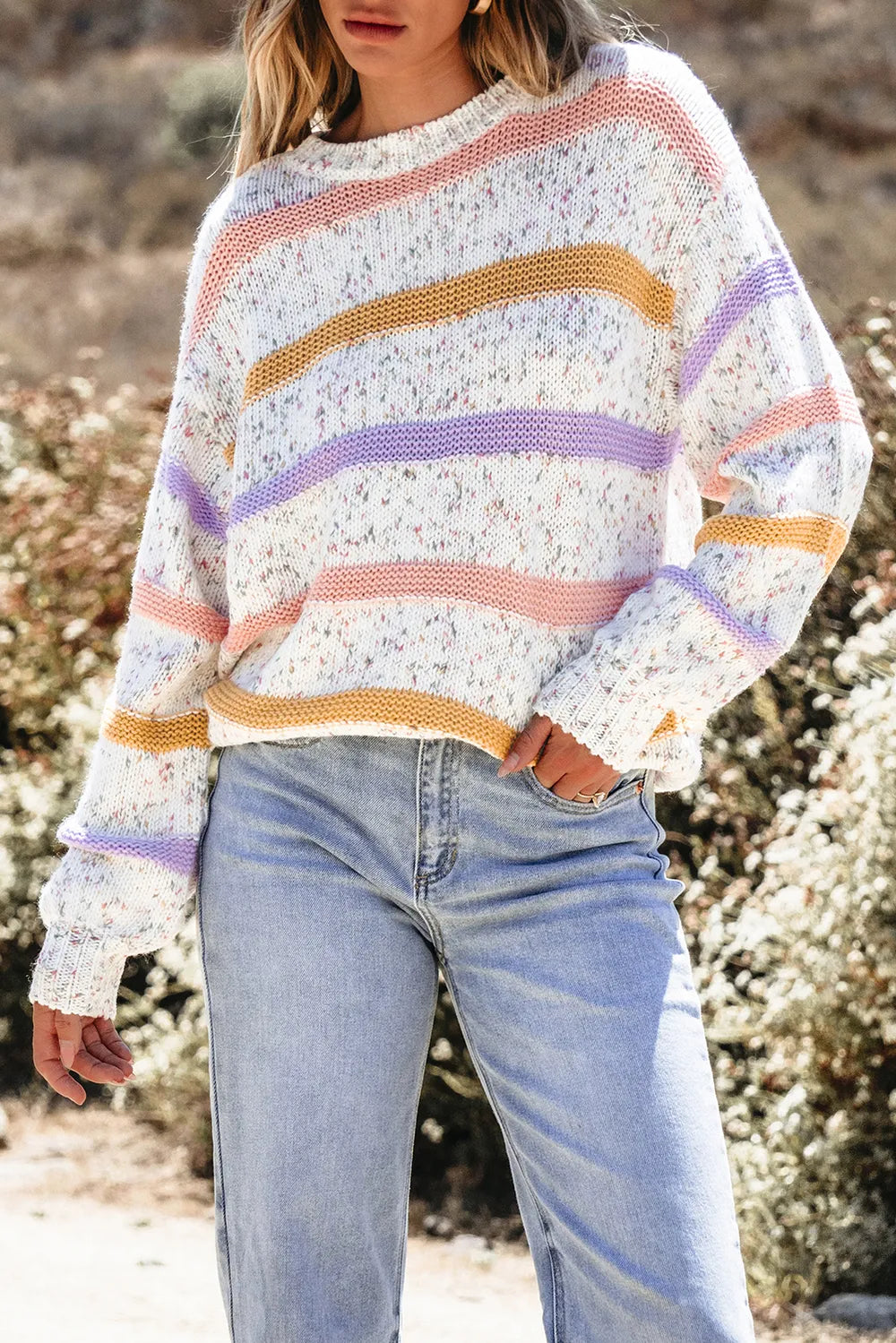 Contrast Striped Round Neck Dropped Shoulder Sweater
