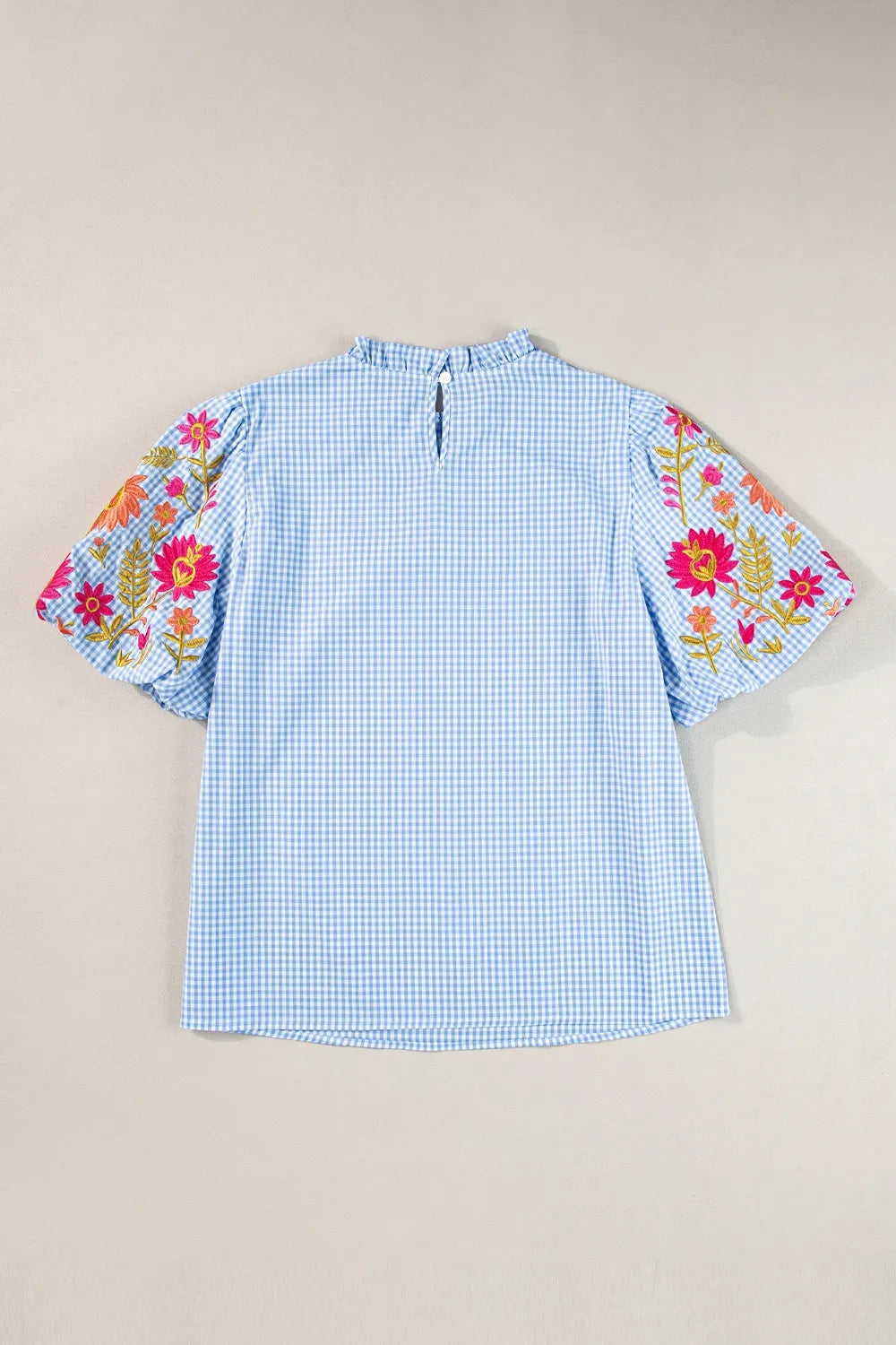 Embroidered Plaid Round Neck Short Sleeve Blouse