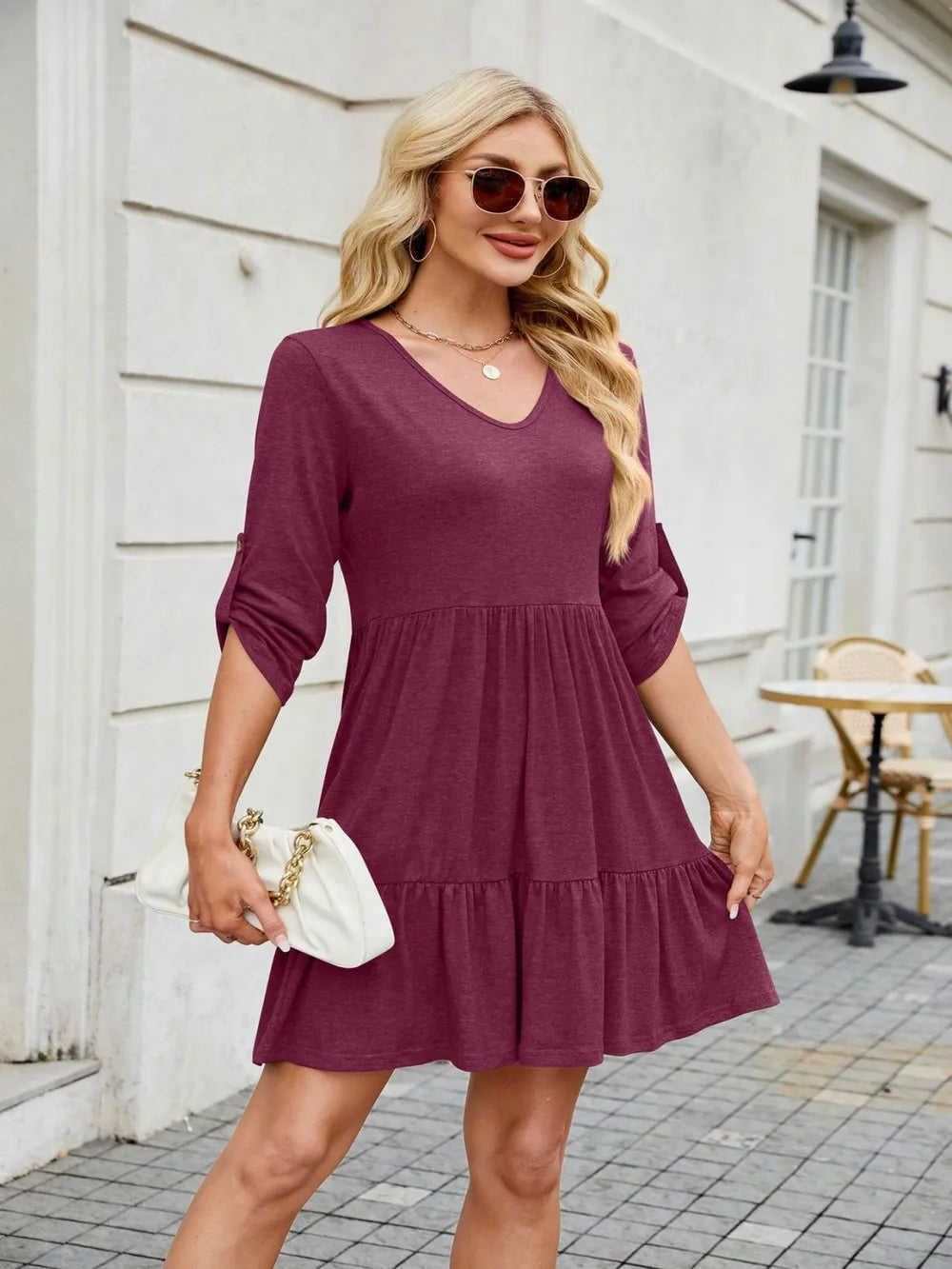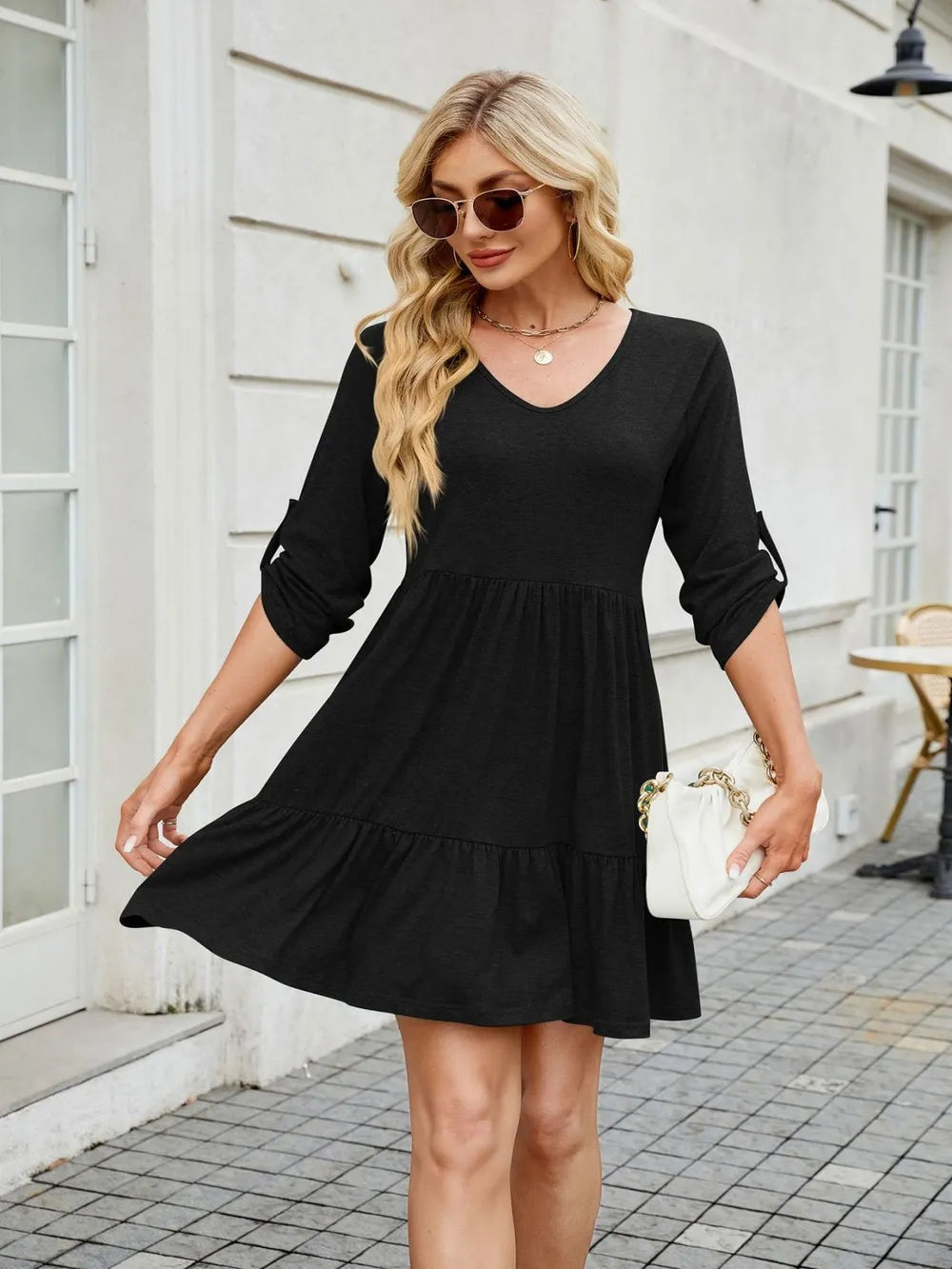 Tiered Ruched V-Neck Mini Dress